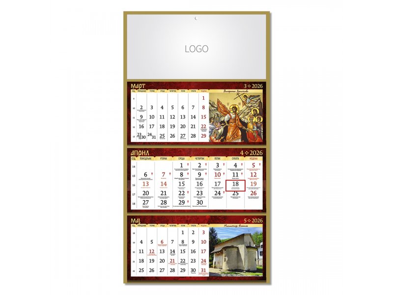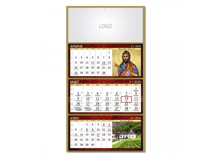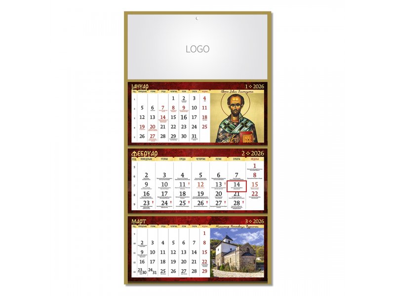 | Opis | Zidni kalendar: 3 x 12 listova, tromesečni, trodelni Dimenzija 32 x 48 cm |