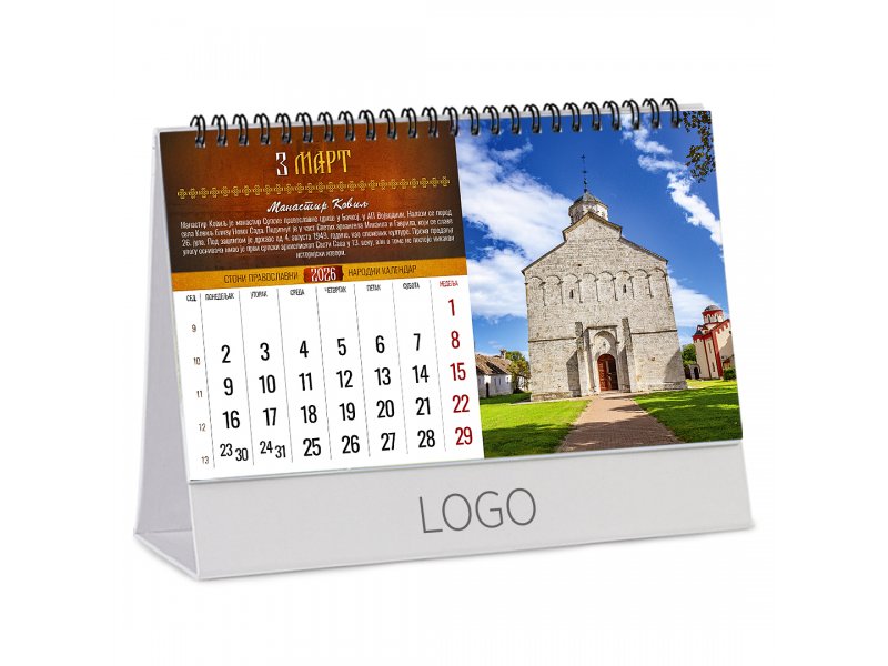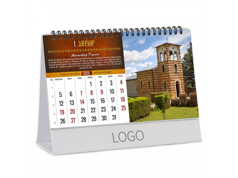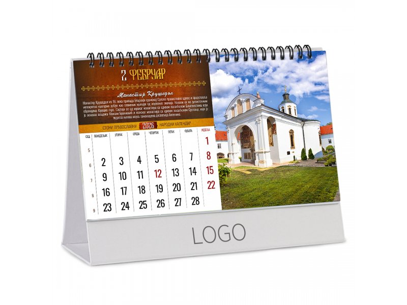 | Opis | Stoni kalendar, format: 22.5 x 13 cm Papir: kunstdruk 150 g/m2 Postolje: kaširan kunsdruk na lepenku Povez: metalna spirala Prostor za štampu: 22.5 x 3.5 cm |