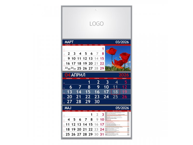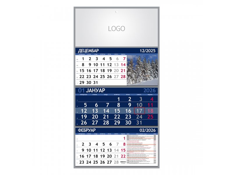 | Opis | Zidni kalendar: 3 x 12 listova, tromesečni, trodelni Dimenzija 30.5 x 44.5 cm |